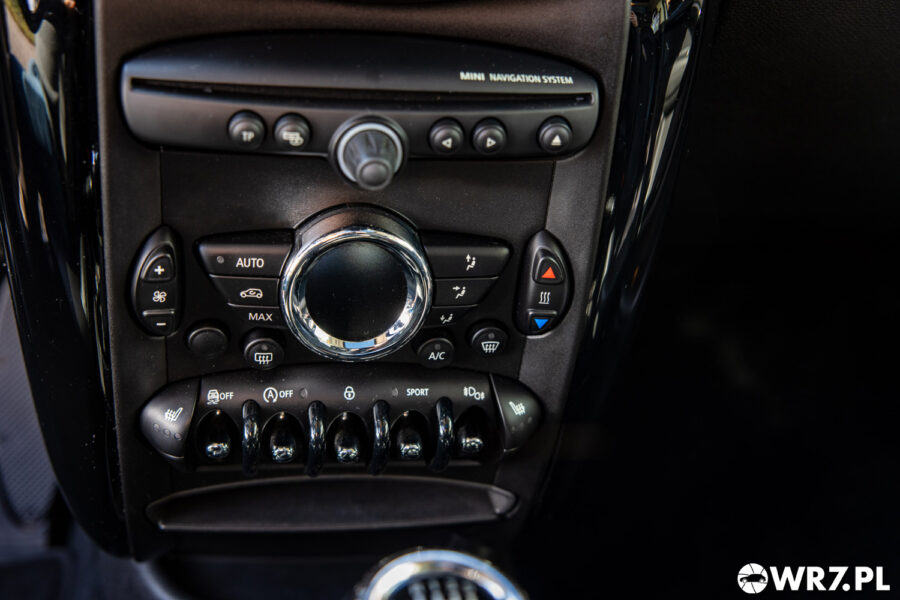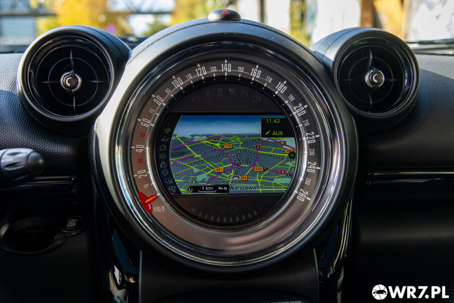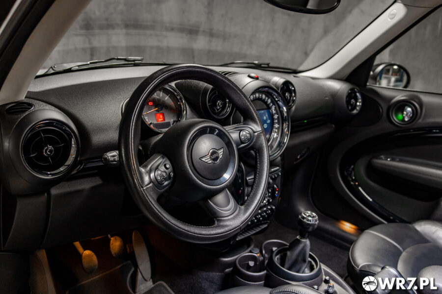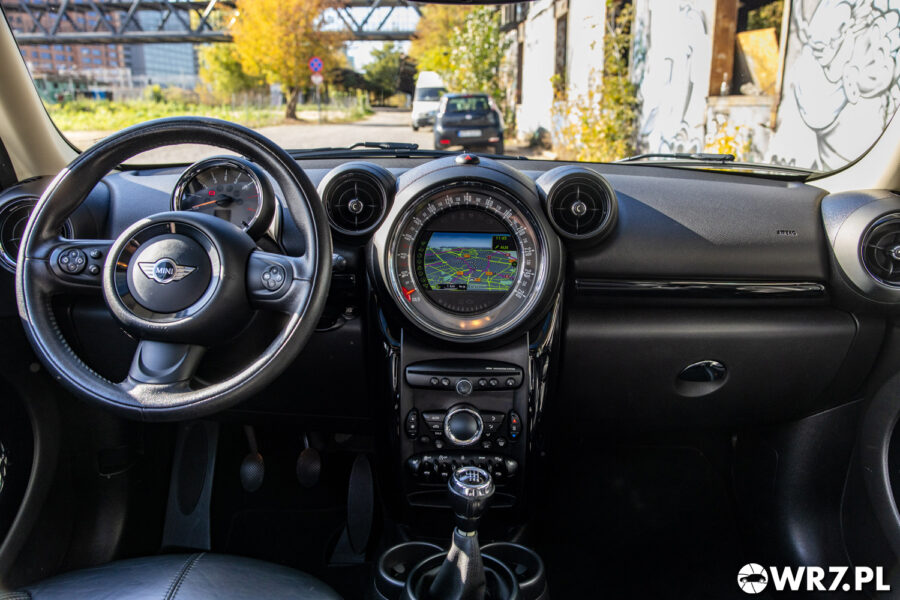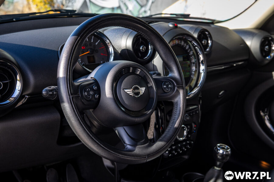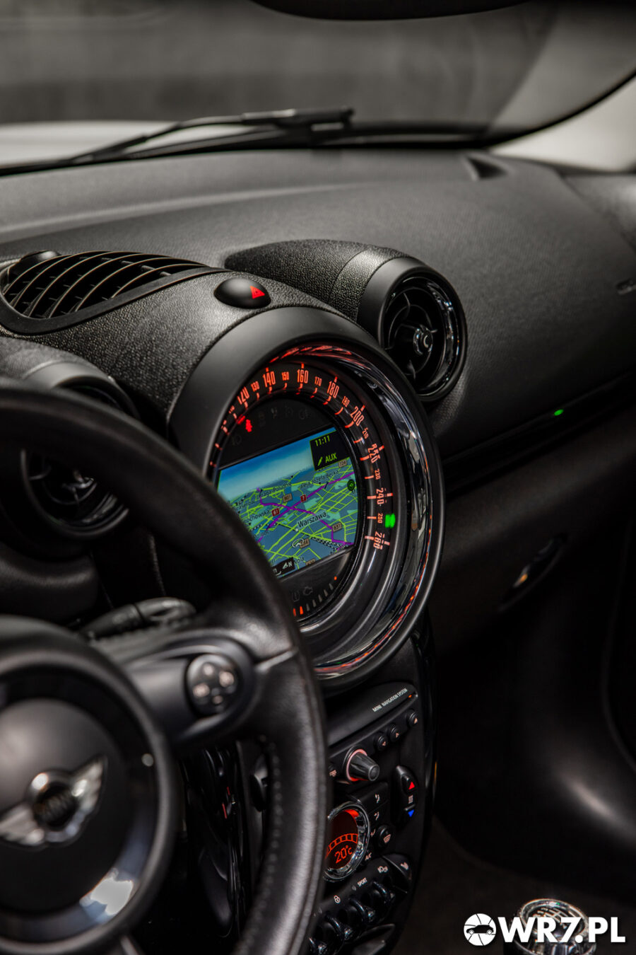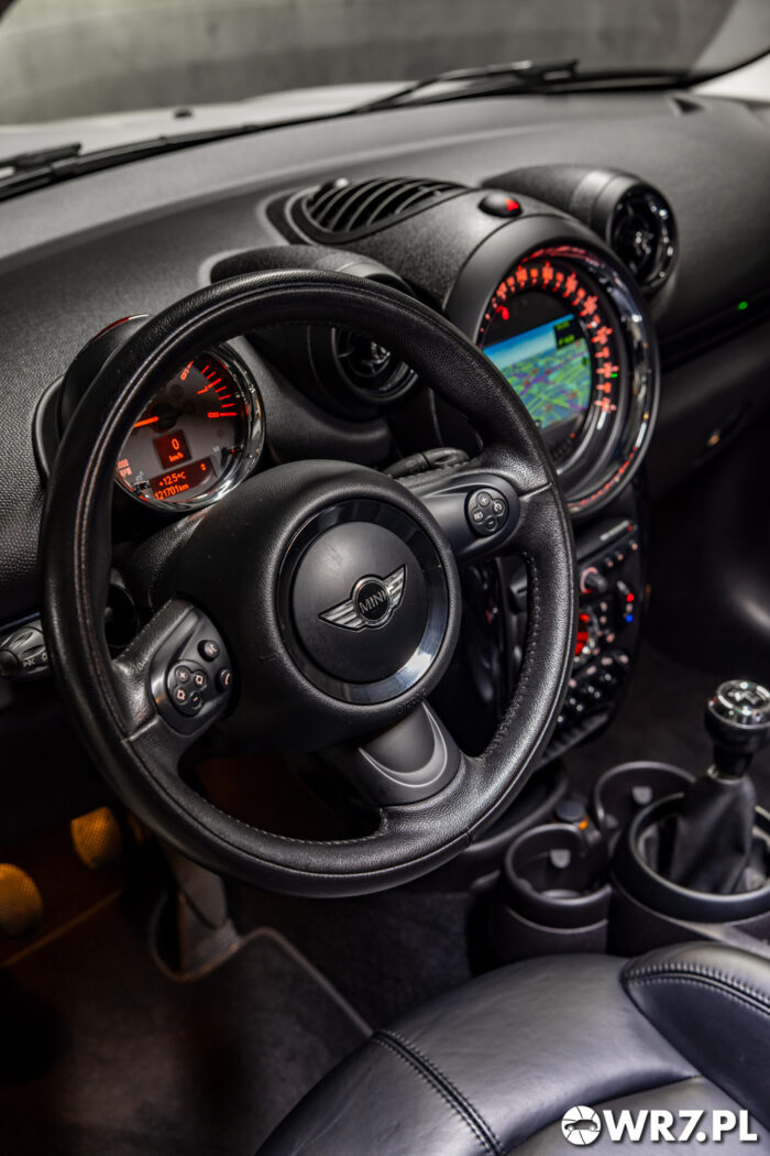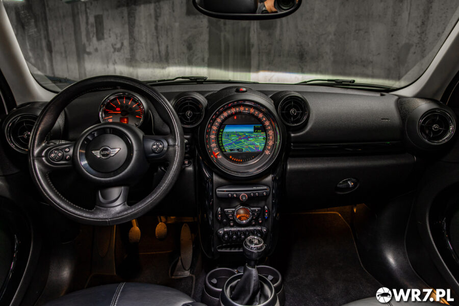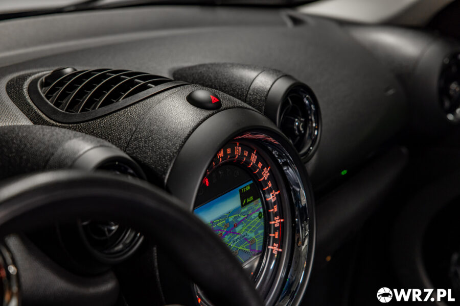 Wsiadając do Mini można się zakochać. Stylowe elementy wnętrza w stylu retro sprawiają, że Countryman zachwyca za każdym razem. Dźwignia hamulca ręcznego przypominająca samolotową manetkę mocy, chromowane przyciski sterujące i analogowy zegar powodują, że wygląd samochodu jest niepowtarzalny.